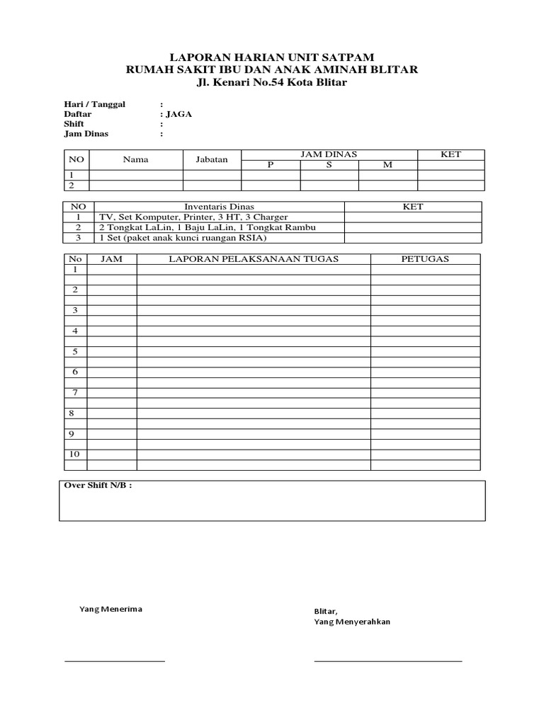 Selain itu di beberapa kampung ada juga pengawal atau ajudan yang berfungsi untuk membantu membawakan. Sekian penjelasan yang bisa admin berikan mengenai contoh buku laporan harian satpam. Data dapat ditulis secara deskriptif atau dalam 9) daftar pustaka; Tuliskan pustaka(buku) yang telah kamu baca sebagai sumber bacaan atau belajar. Berisi contoh kata pengantar yang baik dan benar: Contoh kata pengantar laporan, baik laporan praktek lapangan kerja, study tour, atau contoh kata pengantar makalah alhamdulillah kami panjatkan puji syukur kami ke hadirat allah swt. Rizual azam bin ibrahimzainuriah binti ibrahim perhimpunan harian tiada. Perbaikan jembatan pipa desa tiara rt.03 lokasi : #2 income statement (laporan laba rugi). Laporan akhir ( pdf) jadual caruman bulanan (borang 8a) buku mutasi contoh harian satpam seputar taklimat kontrak perkhidmatan kawalan keselamatan daerah perkhemahan koko. Contoh kata pengantar proposal, makalah, laporan, skripsi kepala seksi dinas pendidikan dasar kecamatan pademangan; Tugas kelompok kewirusahaan laporan hasil penjualan produk anggota kelompok : Berikut ini contoh laporan kegiatan yang bisa ada 2 metode dalam sebuah laporan;